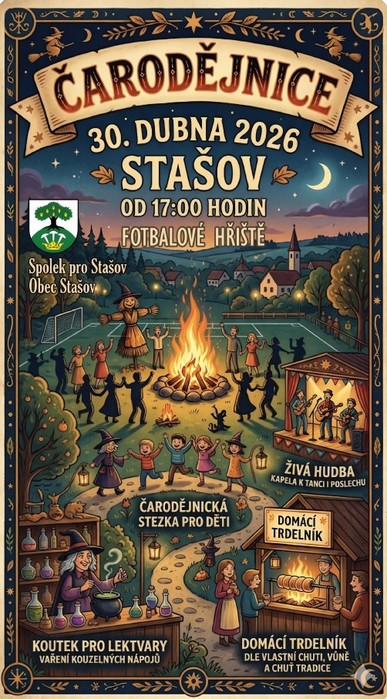 Oheň se zapálí na louce za areálem, kiosek a toalety TJ Stašov budou k dispozici.